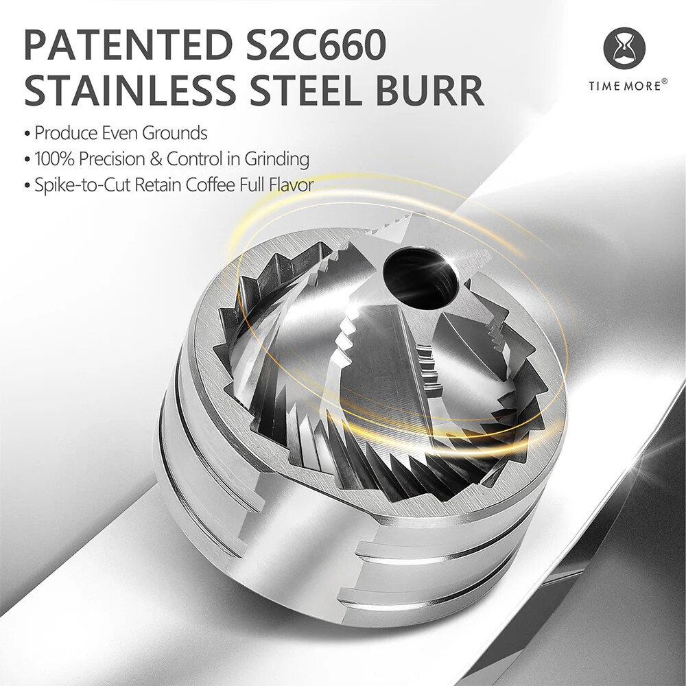 - Конические жернова S2C из нержавеющей стали диаметром 38 мм: обеспечивают равномерный помол с минимальным количеством мелких частиц, ускоряя процесс и сохраняя вкус зерен.