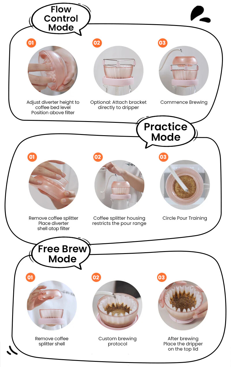 - Три режима заваривания: Комплект предлагает три режима — "Контроль потока", "Практика" и "Свободное заваривание", обеспечивая универсальность для каждого ценителя кофе.